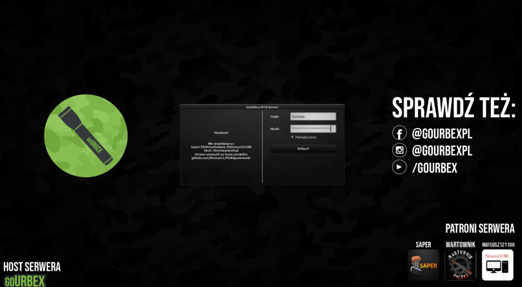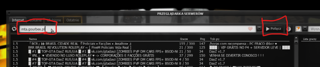 Po zainstalowaniu uruchom grę poprzez MTA, następnie wybierz Przeglądarka serwerów. W pasku adresu i góry wpisz mta.gourbex.pl i kliknij Połącz.